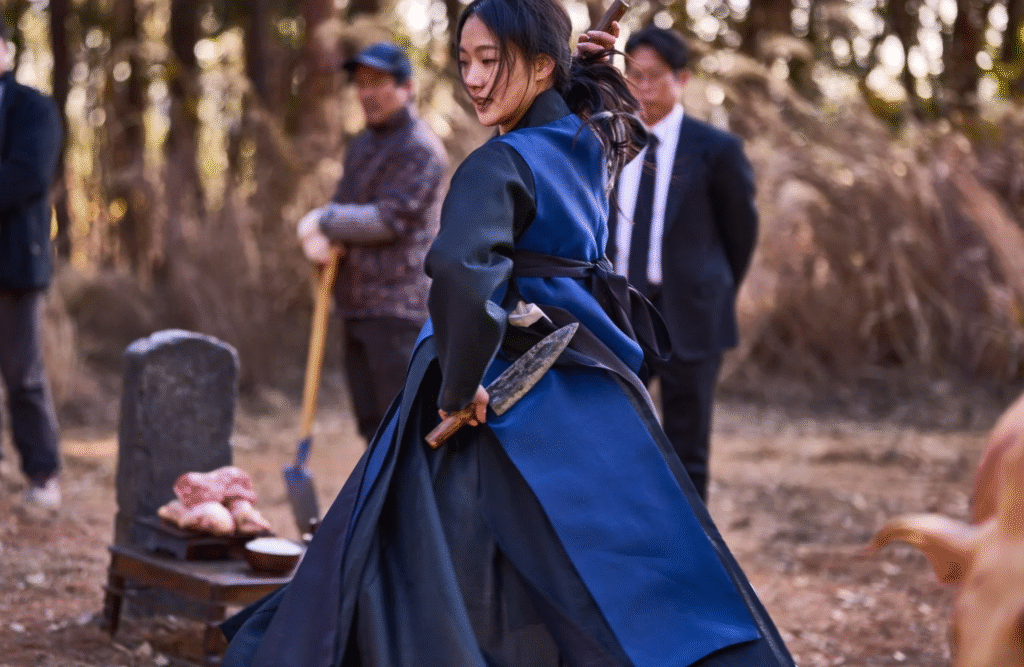Usually, rituals in horror movies are dark, quiet, and disgusting. In Exhuma, the ritual is a banger. The drums are loud, the rhythm is intense, and Hwa-rim dances with knives while slaughtering a pig with the charisma of a K-Pop group’s “Center.”